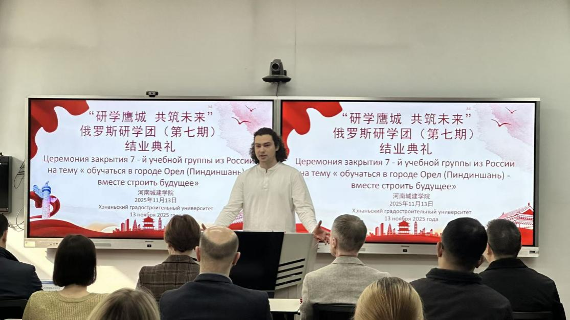 结业典礼上,国际教育学院党委书记吕鹏飞向顺利完成研学任务的学员表示祝贺,并期待他们作为中俄友谊的桥梁,持续推动两校合作。俄罗斯圣彼得堡国立建筑工程大学副校长谢尔盖・弗拉基米罗维奇代表俄方感谢我校的周到安排,充分肯定本次研学的组织成效与学术文化价值,希望进一步拓展合作领域。随后,研学团学生代表分享了在华期间的见闻与感悟,表达了对中华文化的热爱与对未来的美好祝愿。